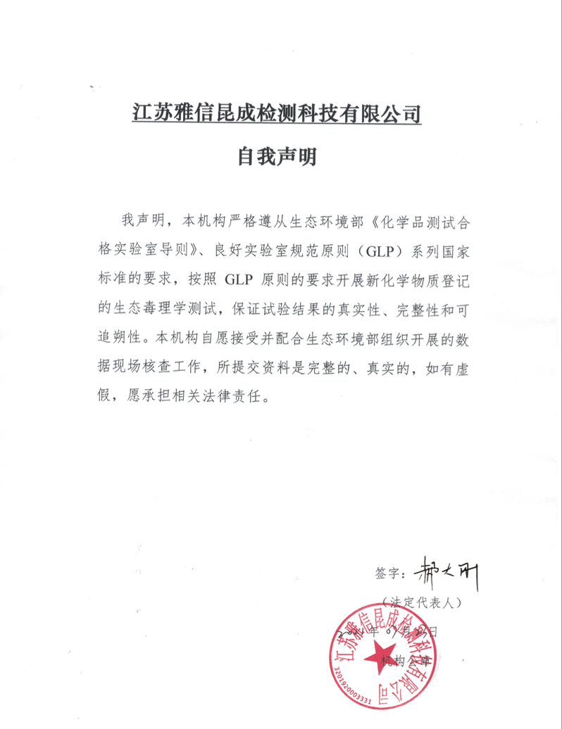 江苏雅信昆成检测科技有限公司位于宁镇扬一体化核心,国家级南京经济技术开发区红枫科技园,专业从事化学品生态安全检测分析。公司占地2000平方米,其中测试区域1564平方米。公司按照国际先进的实验室管理体系运作,建立了符合《化学品测试合格实验室导则(HJ/T 155)》、《良好实验室规范原则(GB/T 22272-2008)》、检验检测机构资质认定(CMA)管理要求的质量体系,目前已获得“资质认定 计量认证证书”(编号241014340115)。 公司拥有测试实验室36间,对样品存储、生物预养、染毒、检测分析、档案保存等不同功能区域的进行绝对空间隔离,能够充分满足现有的测试能力和任务需求。目前主要仪器设备300余台套,包括高效液相色谱仪HPLC、三重四级杆液质联用仪LC-MS-MS、气相色谱仪GC、气质联用仪GC-MS、有机碳分析仪、电感耦合等离子质谱仪ICP-MS、紫外/可见分光光度计等各类大型分析仪器;测压呼吸计量仪、生化培养箱、数显恒温振荡器、人工气候箱、光照摇床、大型恒温水浴槽、鱼类繁育与培养系统、受试物溶液配制装置等测试设备;COD测定仪、多功能水质参数测定仪、显微镜、电子数显卡尺等生化检测仪器以及防磁柜、温湿度记录仪等配套设备。主要仪器设备定期开展第三方检定/校准、期间核查和维护,确保仪器设备量值的准确可靠,仪器的数量和性能满足本公司化学品GLP测试的要求。 公司从事化学品测试的专职人员共38人。其中机构负责人1人,为高级职称;项目负责人10人,质量保证人员4人。在教育程度方面,硕士研究生为13人,占比34%;本科生为17人,占45%;其余为专科生。此外,公司还拥有一批国内外知名专家,为困难物质的测试评估提供技术支持。人员专业背景涉及生物化工、化学工程、环境工程等不同学科;人员的教育程度、工作经历、专业能力和组成满足开展化学品GLP测试的要求。 |